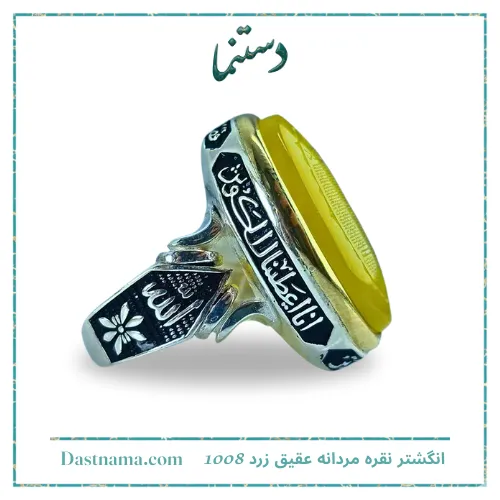 انگشتر نقره مردانه عقیق زرد کد 1008 جلوه ای از اصالت ایرانی، هنر دست استادکاران چیره دست و ارزش گذاری واقعی بر زیبایی طبیعی سنگ های اصیل است. ترکیب نقره با حکاکی های مذهبی و نگین عقیق زرد، این اثر را به جواهری منحصربه فرد در میان زیورآلات مردانه تبدیل کرده است. حضور این انگشتر در استایل روزمره یا رسمی، نشانی از سلیقه ممتاز و علاقه مندی به هنر فاخر و اصیل شرقی است.